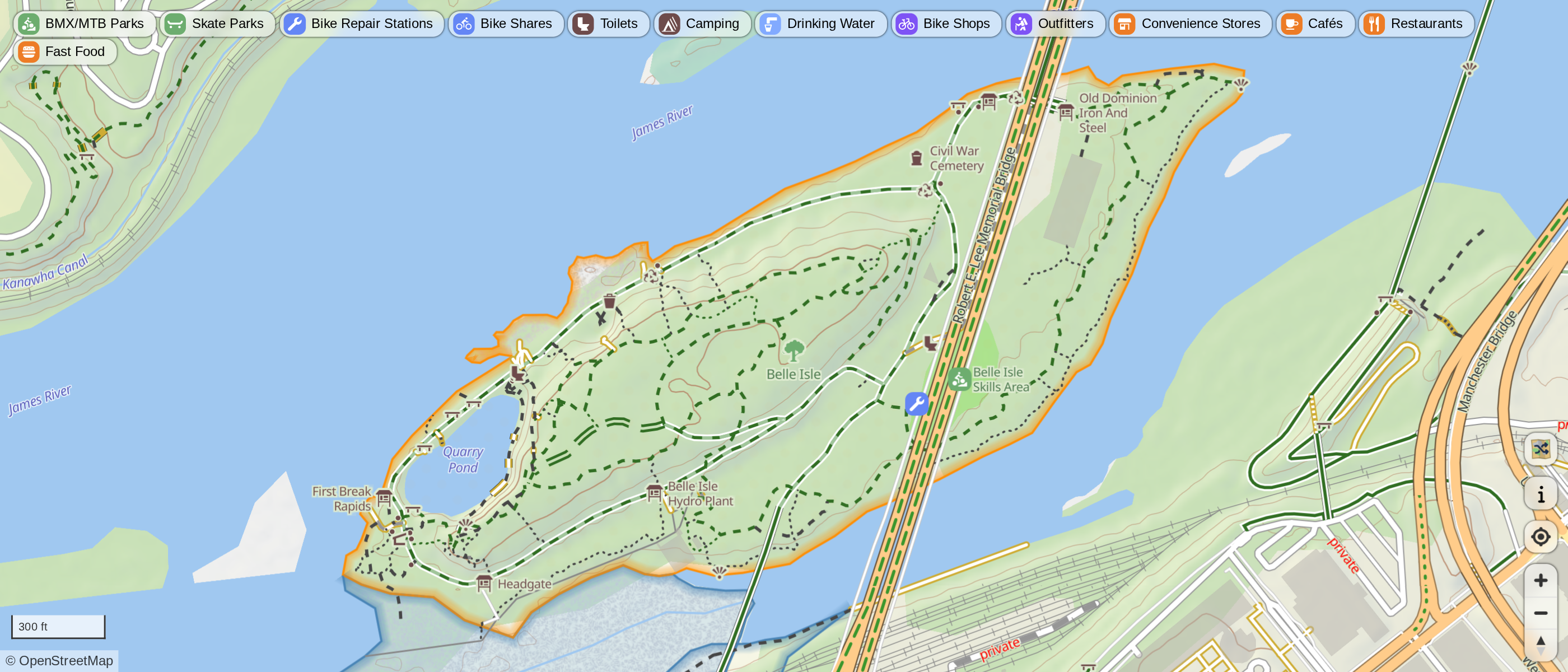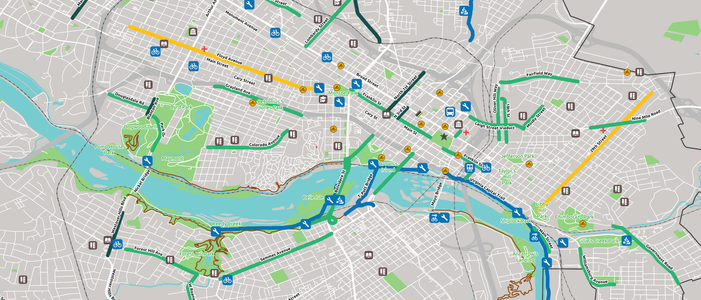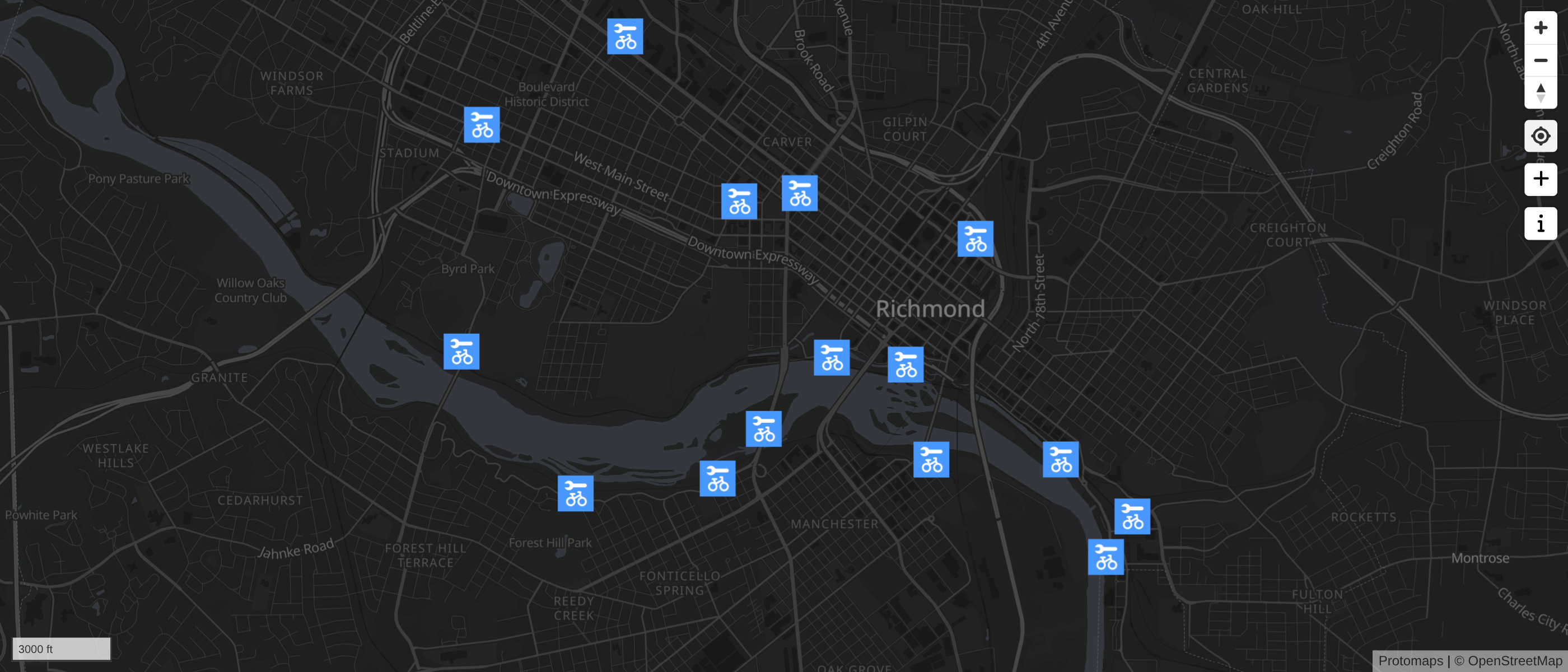 View 3mi Map View 7mi Map View 14mi MapA map of Richmond, Virginia's bike infrastructure created for BikeWalkRVA. Created using QGIS and OpenStreetMap data.