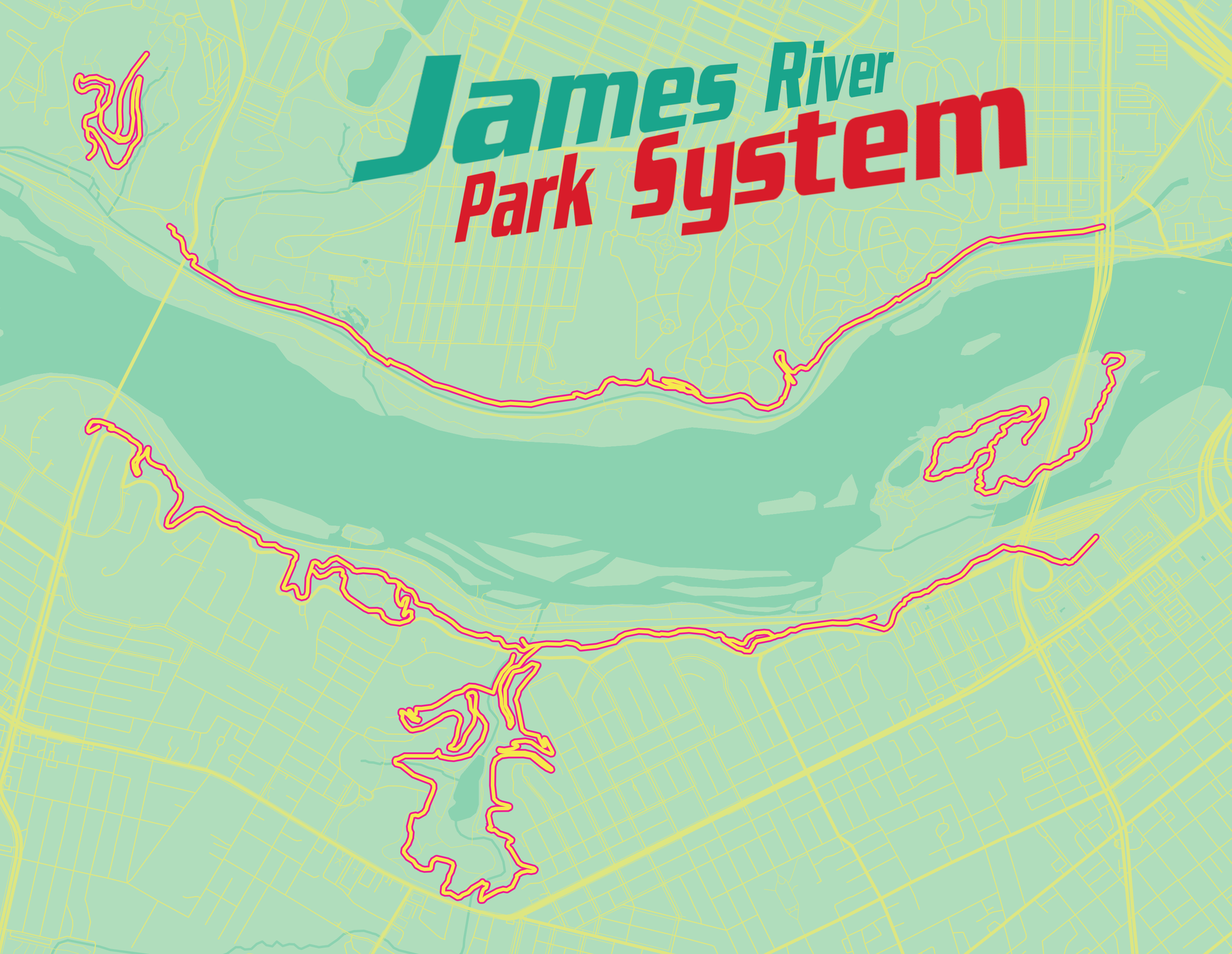 View appPart of signing up for MountainCat100 is to create a valentine for the James River Park System Trail crew. This map was my valentine for 2025, inspired by mtncat's Mountain Dew Baja Blast theme for the year. Created using Palette Map and Gimp.