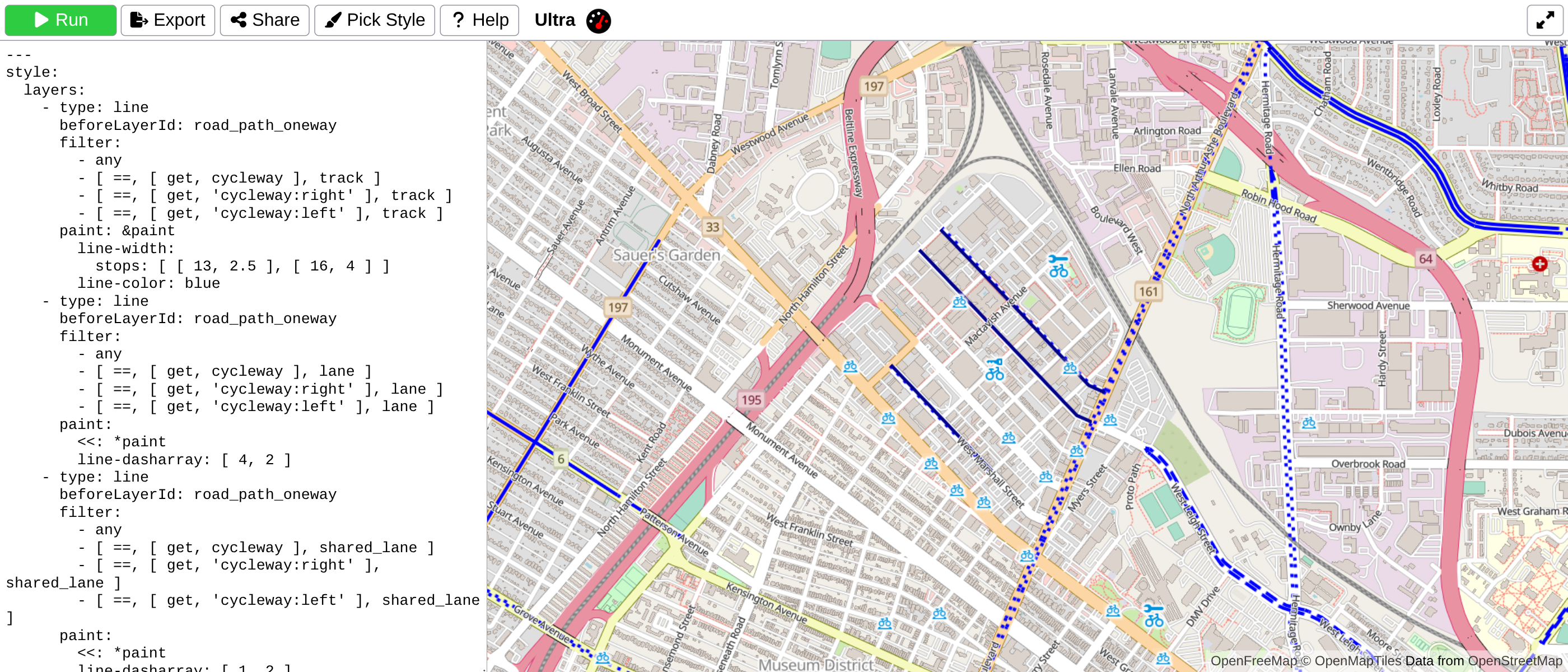 View Map View SourceUltra is a web based tool for making MapLibre GL maps with data from sources such as Overpass, GeoJSON, GPX, KML, TCX, and more.